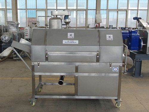 該轉(zhuǎn)篩為內(nèi)篩式過(guò)濾,通過(guò)篩網(wǎng)上焊接的內(nèi)螺旋不停的轉(zhuǎn)動(dòng),逐漸把脫水后的固形物推出去,過(guò)濾后的清液經(jīng)轉(zhuǎn)篩外的不銹鋼腔體收集后從管路排出,從而達(dá)到固液分離的目的。